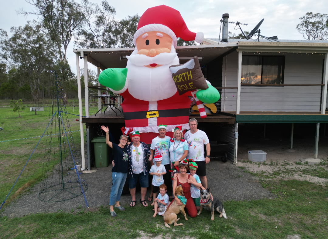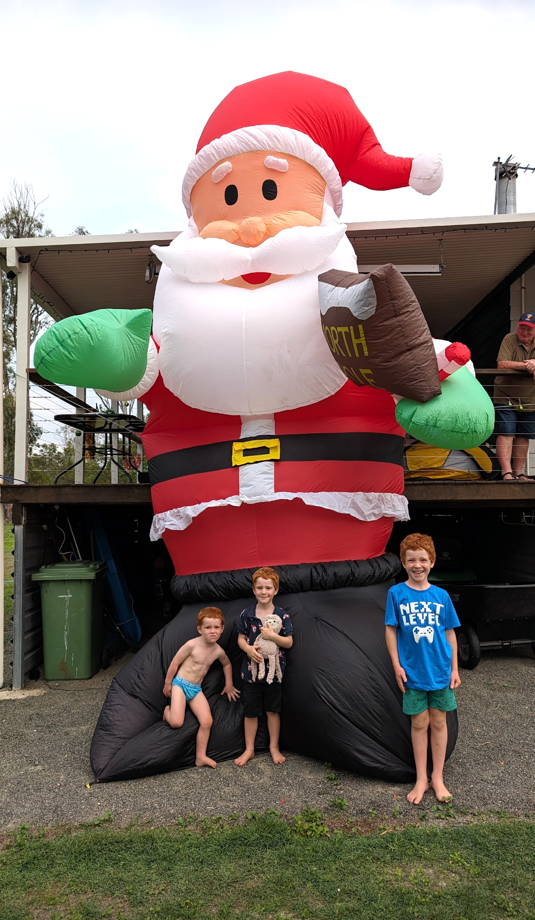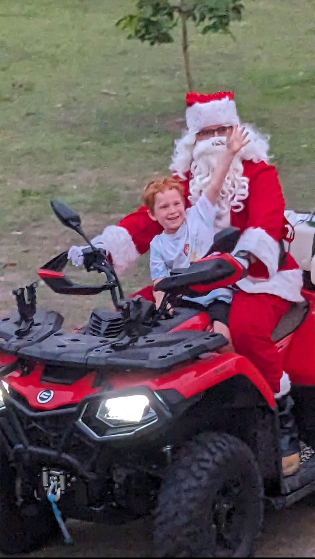 We shared some delicious nibbles and spent time decorating our festival T-shirts. We got photos in front of the Big Santa, with the dogs and cats too. Taken by drone, of course, so everyone could be in the picture. Then the Event Director went missing. But, right on sunset we got the surprise of our life when he returned with Santa… riding on a quad bike!!