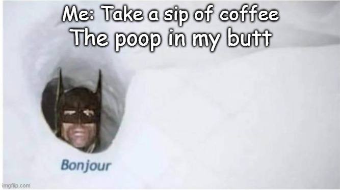 I‘m squatting. I made it! The sense of relief is immense. That was a close one. I’ve almost finished pooping and have started to use my wipes when I hear Middle Man calling out! Shit!
