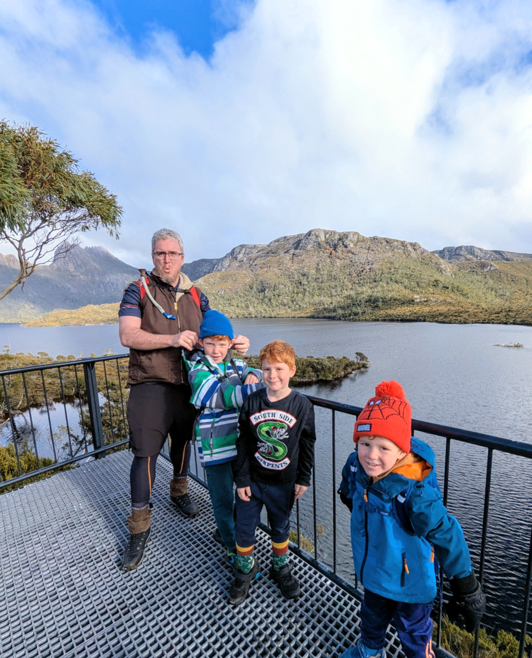 It was a drizzly morning and we decided to all venture out as a group of 7 – four adults and three kids. When I say it was drizzly, it could better be described as – icy cold, blowing wind and piercing rain. We were going to walk the Cradle Valley Boardwalk, at least to Snake Hill, from the Ronny Creek bus stop. An easy 45 mins. Except that when we got to Ronny Creek, we needed to use the toilet. No worries, the closest one to the bus stop was at Waldheim Chalet, 2kms uphill, nearby the beginning of the Overland Track. So, we started venturing up the skinny boardwalk track through open buttongrass lands. Icy cold, windy, exposed, adding another 2 kms to the hike. I was starting to get a bit over the cold. I hadn’t packed gloves for the kids, or beanies, as it had been sunny when we left camp.