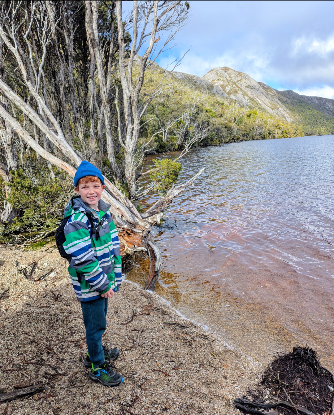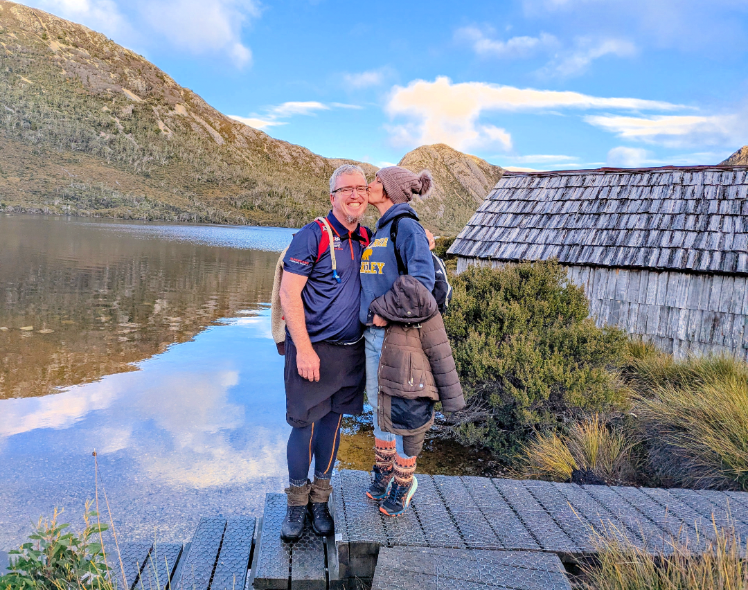 The scenery was stunning around Dove Lake, and the terrain and track was constantly changing, from timber boardwalk through temperate rainforest, to climbing gravel and quartz rocky staircases surrounded by alpine heathland. We had sunshine one minute, and cold misty rain the next. But we didn’t get bored of the views around Dove Lake and after many climbs, we would turn around and marvel at the impressive rocky peaks of Cradle Mountain. Ok, maybe some sections got the better of Crazy Cat…