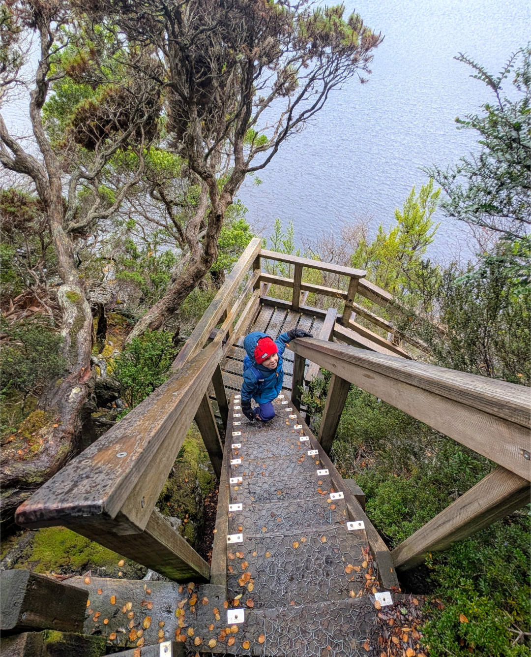 In the next section, however, he’d spot some interesting fungi, or a trickling waterfall, and he’d be excited again. Having lunch at a little rest stop along the way was truly memorable. Making hot chocolates for the boys (even if they mostly got poured out!) and tea and coffee for us from the thermos, as well as warm tubs of baked beans, cuppa noodles, and chilli beef felt like an absolute luxury to defrost and recharge. The biggest battle was keeping our shoes dry after the Ballroom Forest section, as we climbed through staircases that resembled waterfalls more than stairs. We’d opted for sneakers over gumboots, being such a long walk for the kids, which was a good decision up until this point. We made it to the Lake House, and had enough about 10 mins to spare to get back to the bus shelter before last shuttle bus at 4pm. What an incredible way to spend a day!