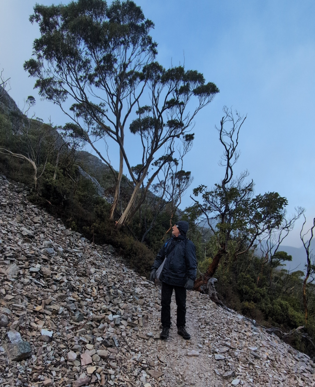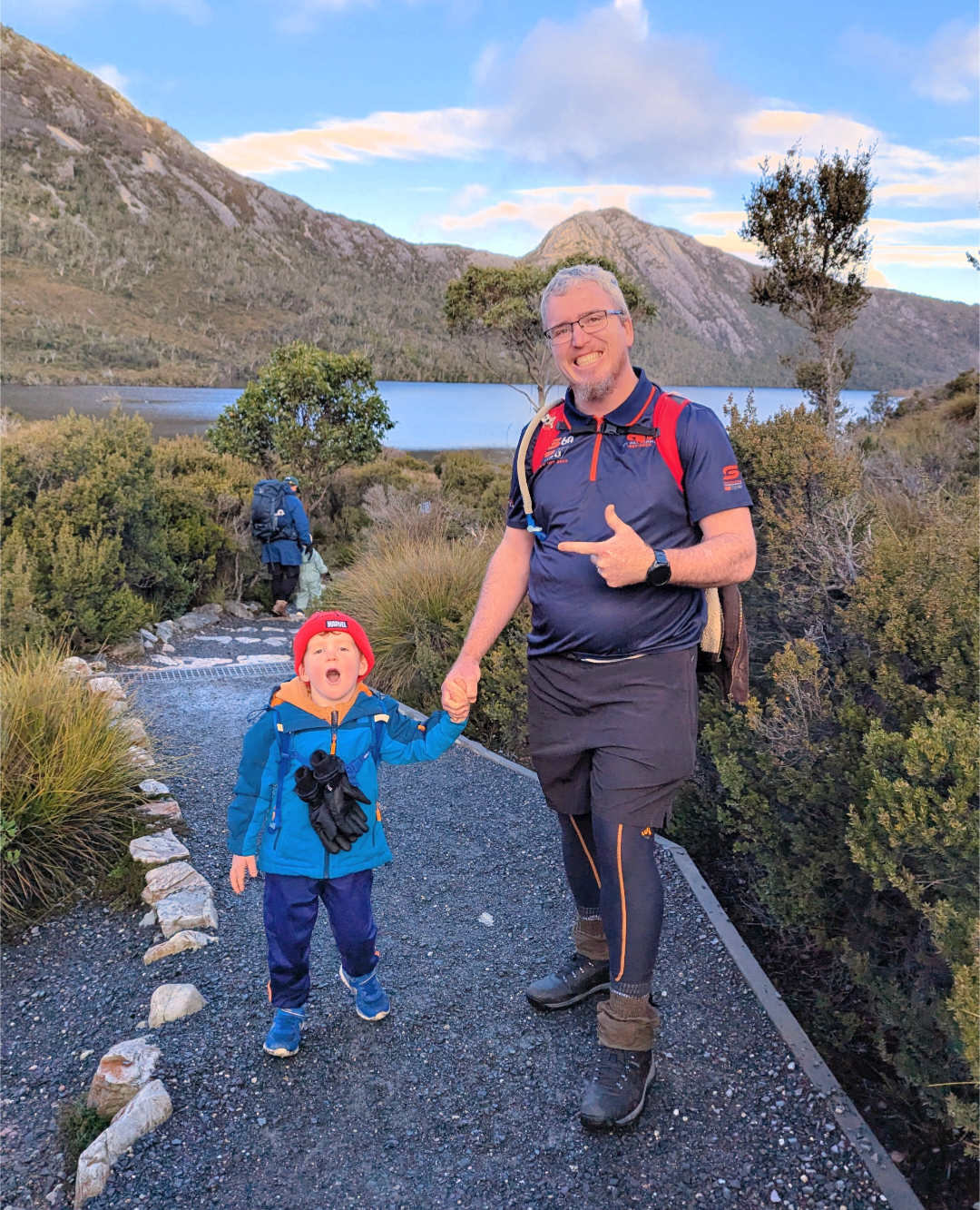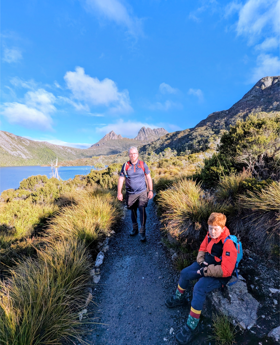 According to the Tasmania Parks and Wildlife Service, it is a Grade 5 walk, which is the most challenging – ‘requiring good fitness, rock scrambling skills, and a head for heights’. Bloody oath! It lived up to its name and level of difficulty. The guys drove up to Dove Lake car park at 7am, beating the shuttle bus, and in -5 degree temperatures, they started the climb. This is only the second time that I have seen Hubby wear long pants (technically long skins and shorts) on our trip. He insists that he’s not cold most of the time. Fair enough. I don’t think that the Tassie locals believe that he’s a Queenslander. The rest of us are rugged up to buggery! He admitted that it was in fact cold at the start of this hike.