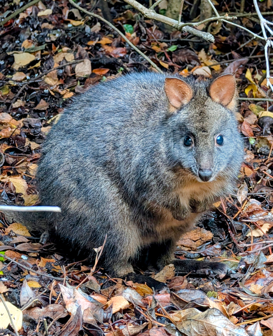 Lulled into a false sense of security, I had not dressed warm enough, I did not have my raincoat, so my big jacket was quickly soaked. The kids were underdressed. Hubby took off his long socks to give to Middle Man, acting as leggings because he’d only worn footy shorts. Almost up the hill to the bathroom we saw a little movement off to the left of the boardwalk – “Stop, there’s a wombat! And it’s a got a baby Wombalena!” I yelled ahead to Middle Man, who was leading the group.
