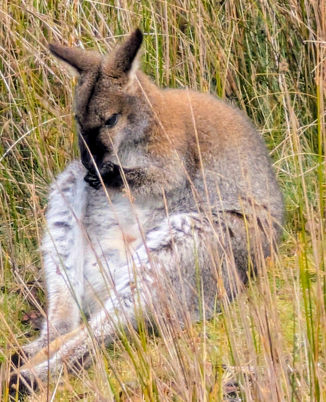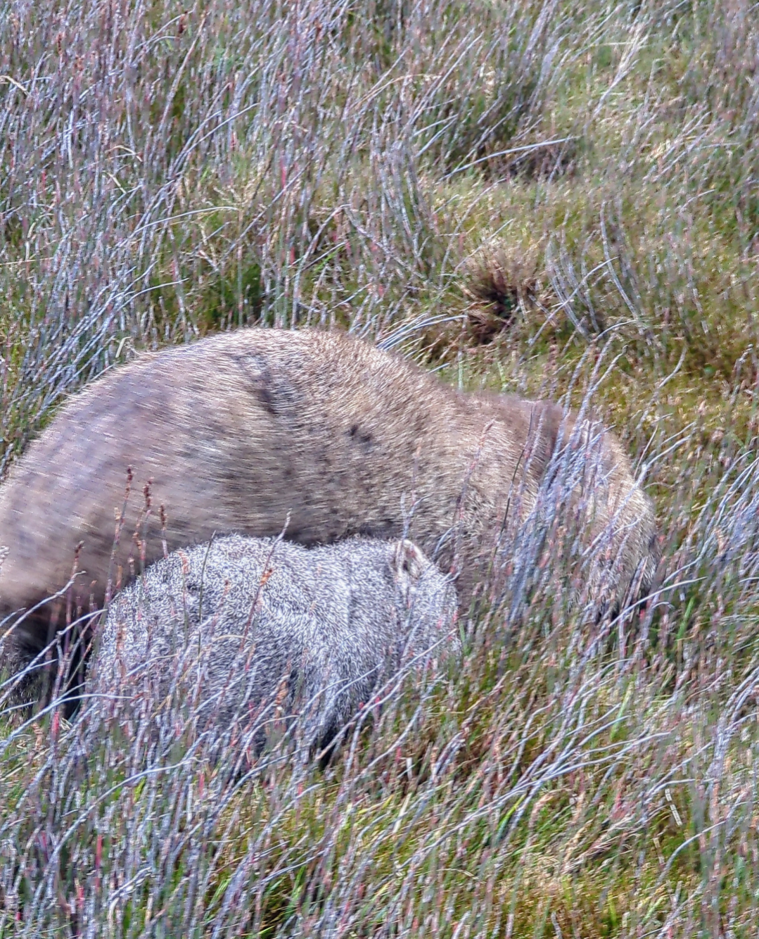 The little wombat was absolutely adorable. Mumma wombat decided to cross the boardwalk, right in front of Middle Man, with baby trailing behind. Then all of a sudden, baby went rogue and ran away from Mumma, back up the hill, possibly towards their burrow. Mumma seemed oblivious, and carried on eating, as wombats do. We quickly got out of their way, continuing uphill on the track. About 10 mins later, after our toilet break, we peered back down onto the grassy plains , where we could see that the pair had reunited. There was even a rainbow to celebrate.