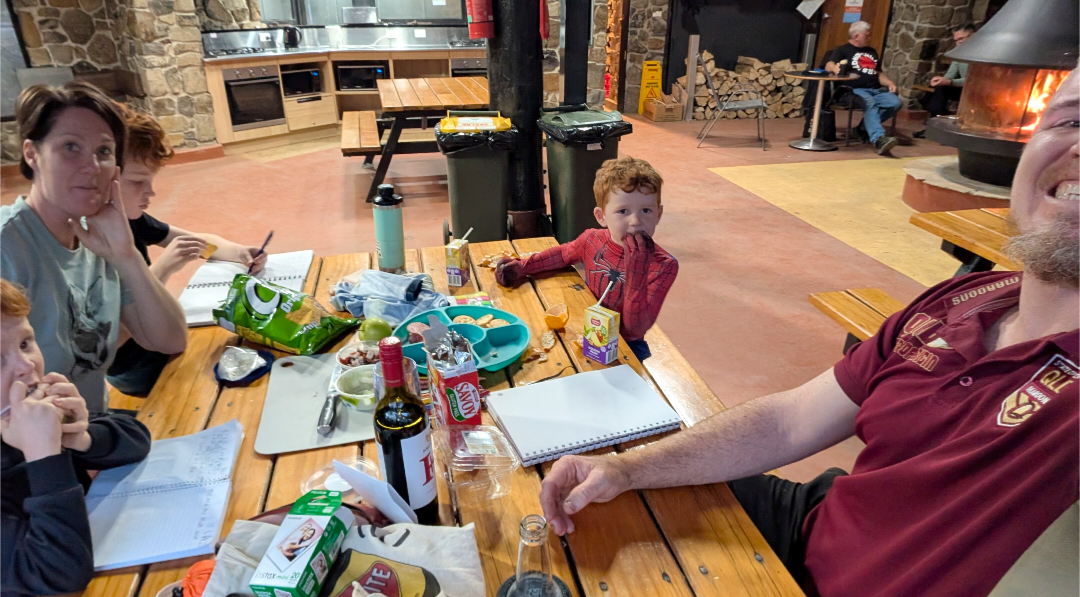 At Melaleuca Camp, there was a central fireplace, and it was so toasty indoors there that we could actually strip down to shirt and shorts. Another rainy afternoon, was spent there catching up on writing our travel journals and doing some school work. Not a bad gig for the teachers (Mum and Dad) who got to drink red wine and eat a nibble platter by the fire!