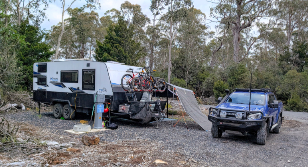 The Enchanted Forest was a really easy walk. No big climbs, a boardwalk for the entire circuit, absolutely gorgeous moss-covered rainforest and a crystal clear flowing stream and waterfall. We saw our first wombat on this walk, right next to the pathway. It was so close that we could have scoochied his big furry butt, but of course, we didn’t! We admired him nibbling away on button grass, completely oblivious of us, and of the other tourists ogling and photographing him. We decided to come out to this walk for a nighttime spotlighting adventure too. We found some animal bones within a tree hollow, which was spooky. Although we didn’t spot any quolls or devils, we did see another (or maybe the same) wombat munching away right near the path. And a cheeky possum once we got back to our camp!